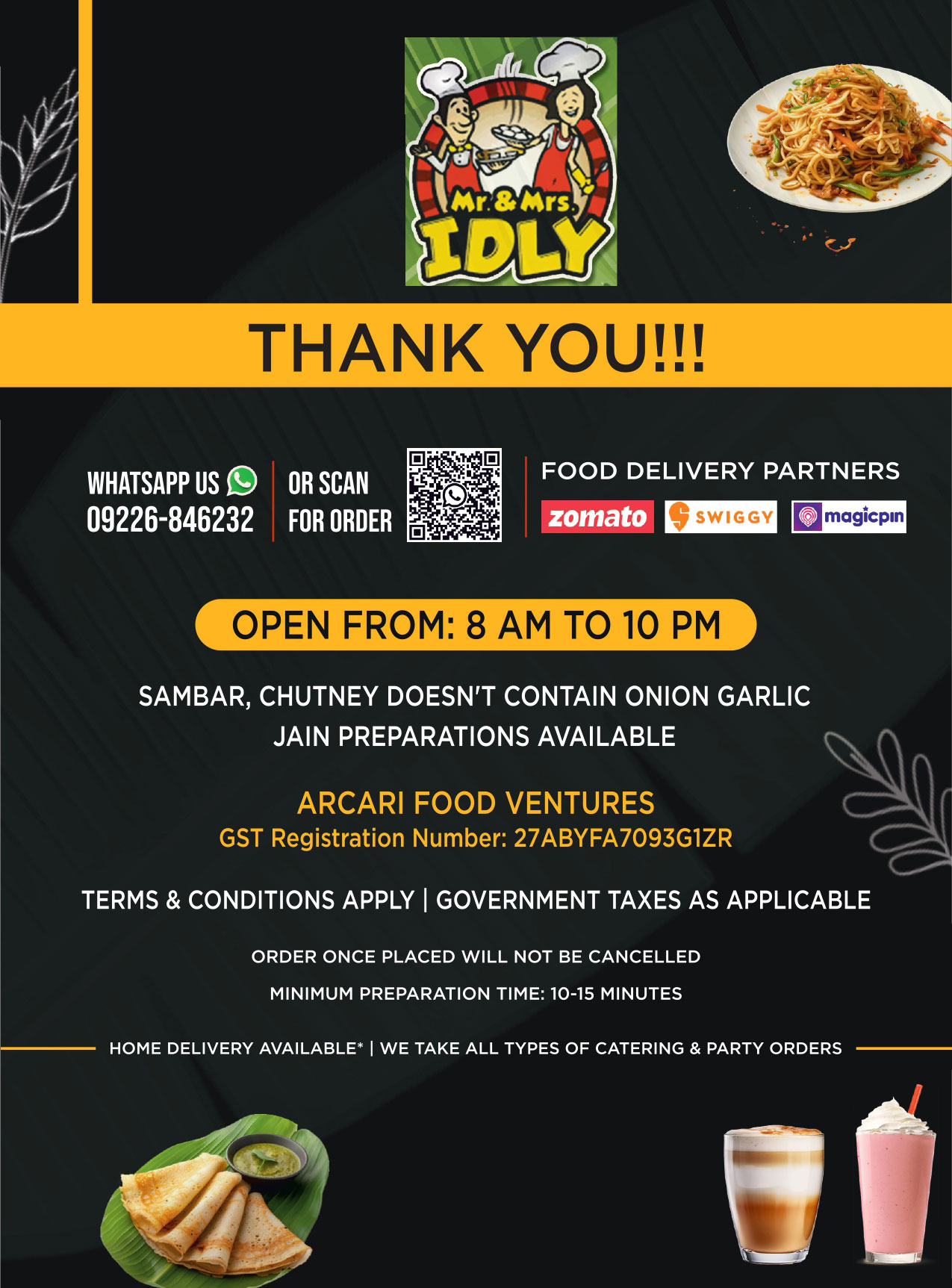© Mr and Mrs Idly South Indian Pure Veg Restaurant, Unit of Arcari Food Ventures All Rights Reserved. Design By .